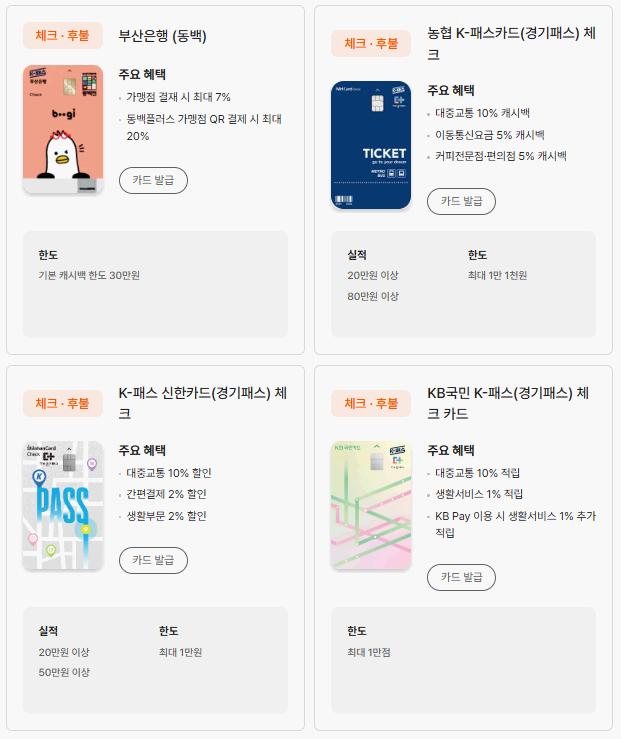 - 연회비가 부담이고, 한달 내에 지출되는 대중교통비가 많지 않다면 후불체크카드나, 선불카드 또는 모바일 신청을 추천드립니다.